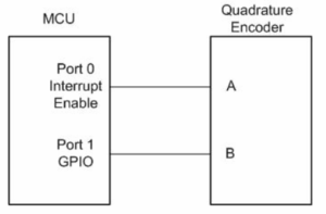 소프트웨어로 Quadrature Encoder를 디코팅 할 경우 디코딩 배수를 선택 할 수 있으며  디코딩 배수에 따라 해상도가 달라 집니다. 배수를 1배수(x1), 2배수(x2) 그리고 4배수(x4)를 선택 할 수 있으며 원하는 배수에 따라 회로 구성과 소프트웨어 알고리즘이 조금씩 달라지게 됩니다. 본 글은 기본적인 1배수 디코딩에 대해 설명하겠습니다. 엔코더의 두 개의 출력 중 A채널 신호를 MCU의 한 개의 I/O포트에 연결하고 B채널 신호는 다른 I/O포트에 연결합니다. A채널 신호에 연결 된 I/O포트는 상승엣지에 Interrupt가 가능한 Input 포트로 설정하고 B채널에 연결된 I/O포트는 일반 Input 포트로 설정 합니다. 연결도는 아래와 같습니다.