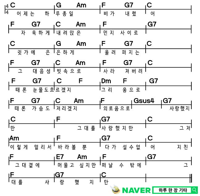 위 코드와 가사의 출처는 “하루 한 장 기타” 입니다.