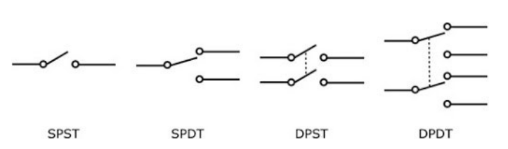 SPST(Single Pole Single Throw), SPDT(Single Pole Double Throw), SP3T(Single Pole Three Throw),