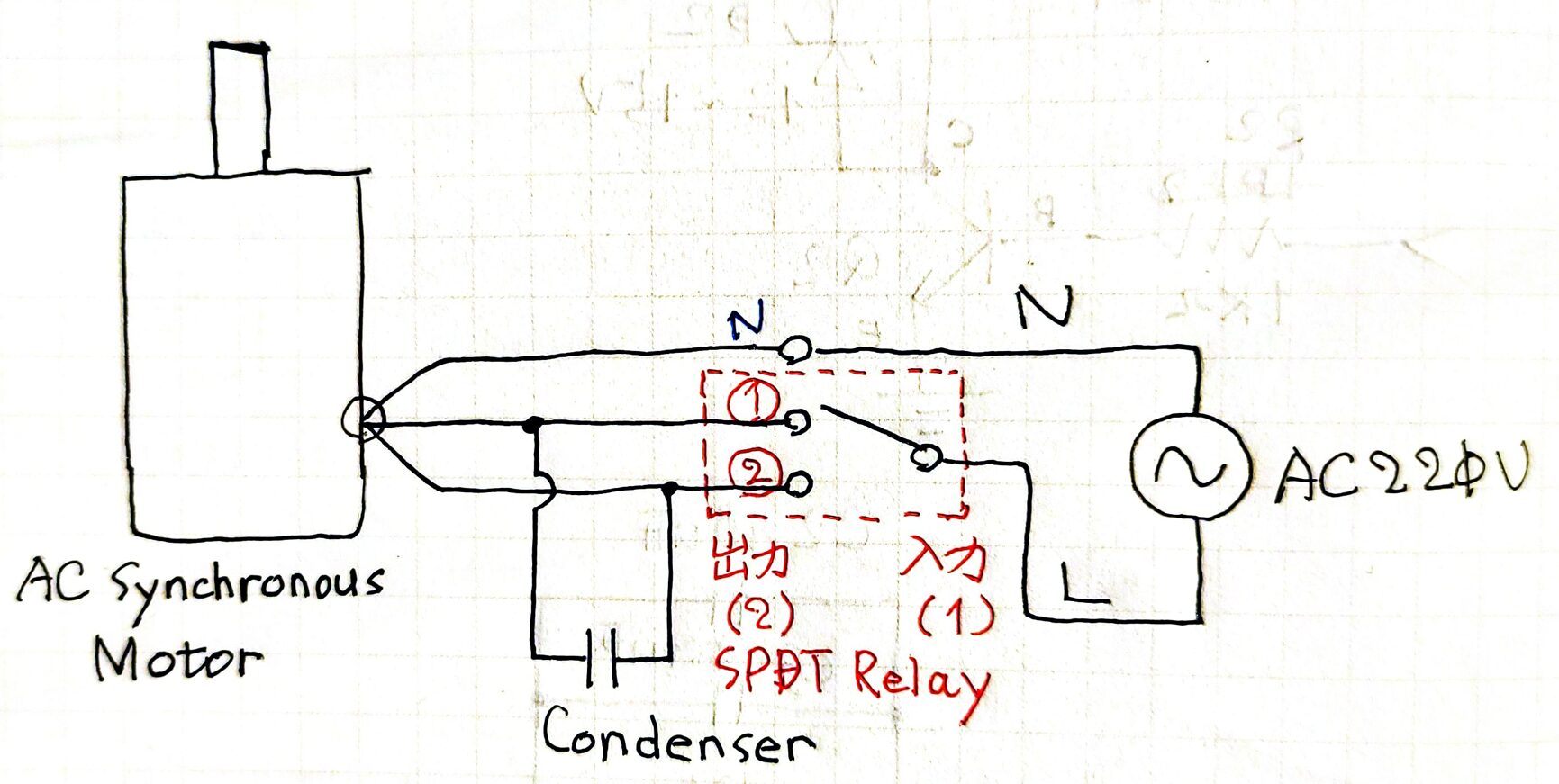 접점 ①과 ② 중 어느 쪽에 콘덴서(C1)가 연결되느냐에 따라 모터의 정회전 또는 역회전이 결정됩니다.