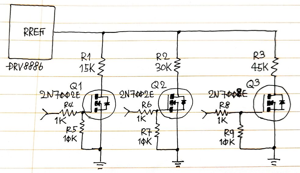 DRV8886AT의 Datasheet에 의하면 아래 그림과 같이 RREF에 연결된 저항값을 변경 해 줌으로써 동작전류를 조절 할 수가 있습니다.