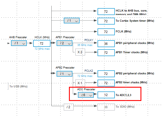 STM32F103의 ADC는 클럭이 너무 높을 경우 측정 오차가 증가할 수 있으므로,