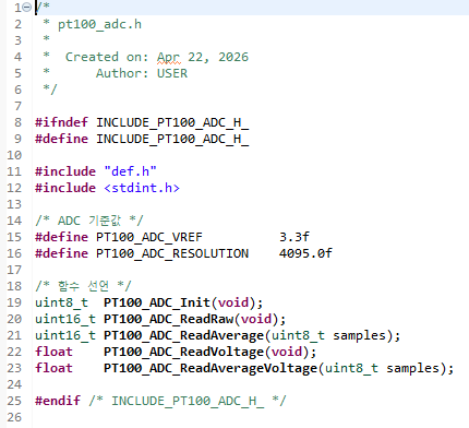 헤더 파일은 pt100_adc.h, 소스 파일은 pt100_adc.c로 구성하였습니다.