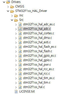 Project Explorer의 Drivers → STM32F1xx_HAL_Driver → Src 폴더에서 확인할 수 있습니다.