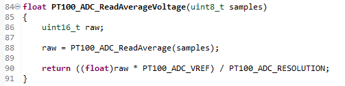 여기서 PT100_ADC_VREF는 ADC 기준 전압을 의미하며, PT100_ADC_RESOLUTION은 12비트 ADC의 최대값인 4095를 의미합니다.