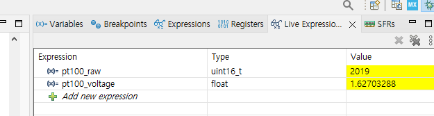 실시간으로 ADC 값을 확인하기 위해 pt100_raw와 pt100_voltage 변수를 Live Expression에 추가하였습니다.