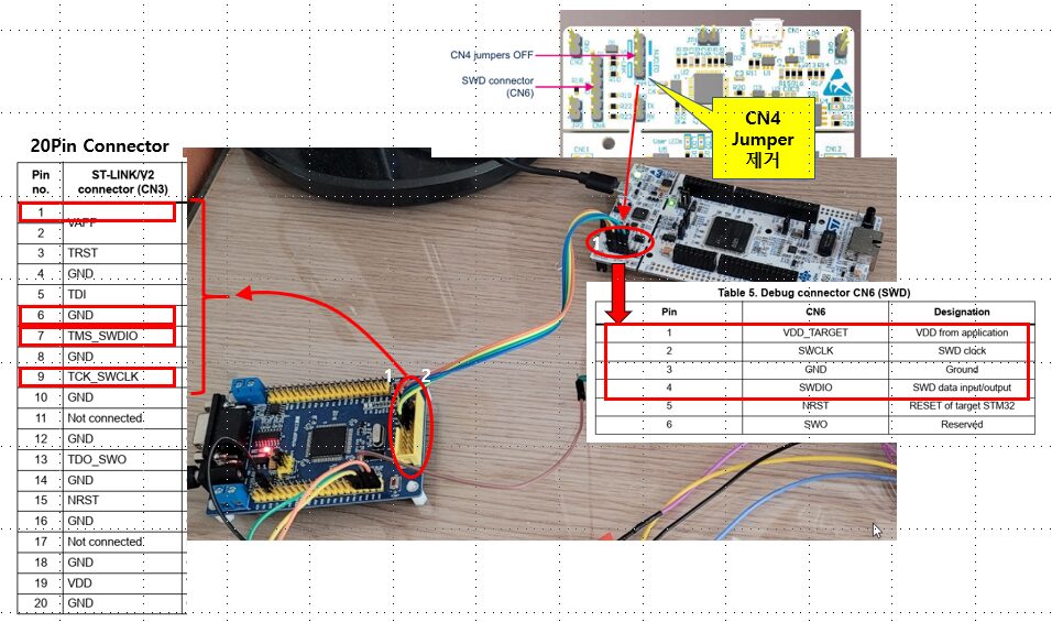 다운로드는 SWD 방식으로 하며 ST-LINK의 20핀 콘넥터를 사용하여 보드의 해당 콘넥터에 삽입하면 됩니다.