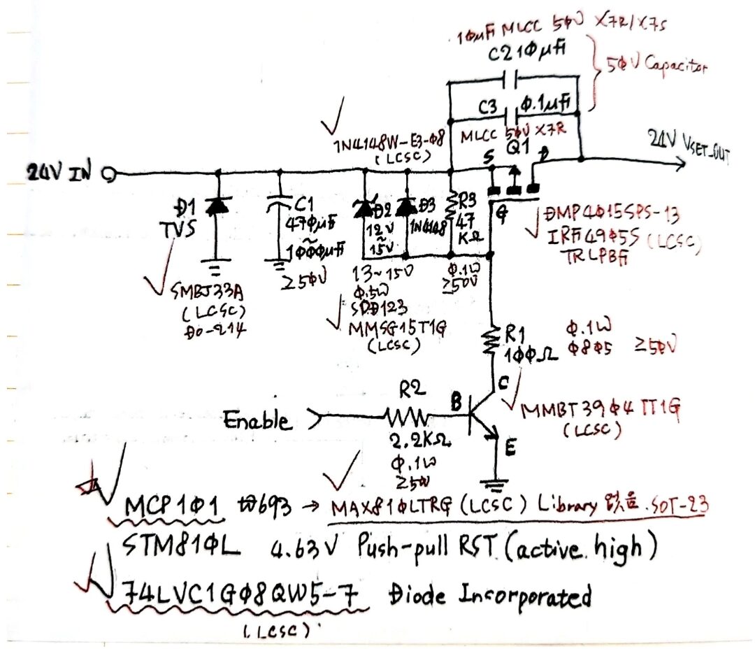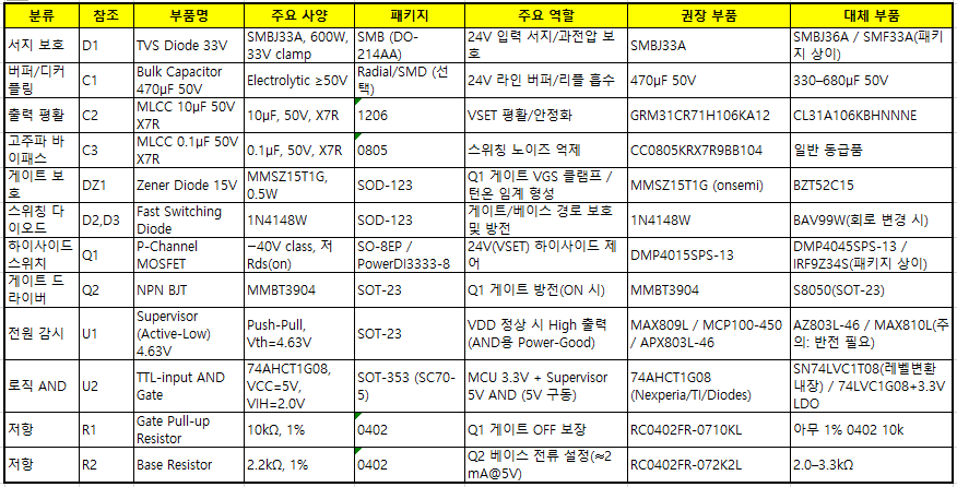 즉, 24V 전원 라인의 상단(+) 측을 스위칭하기 위해 P-Channel MOSFET(Q1)을 사용하였습니다.
