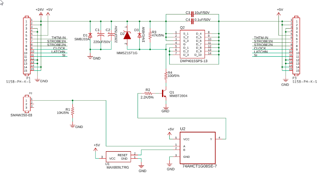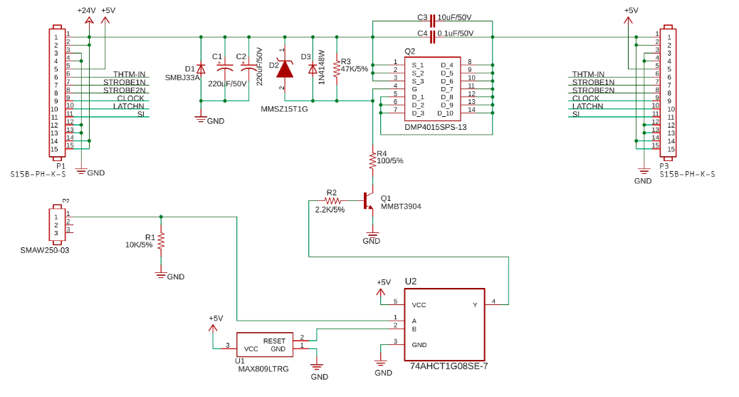 이 보드는 24V 히터 전원(VSET)을 제어하기 위해 MOSFET(Q1)을 사용하였으며,